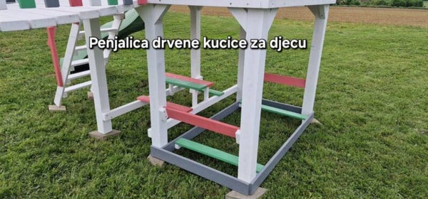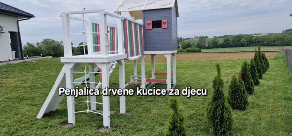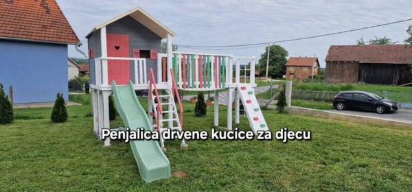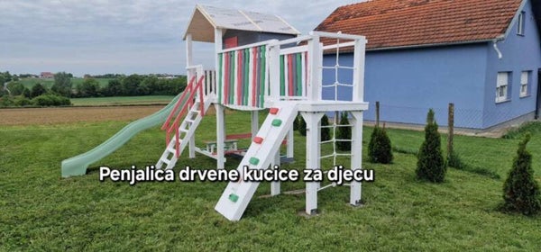 Drvena penjalica s toboganom i ljestvama povezana mostom.