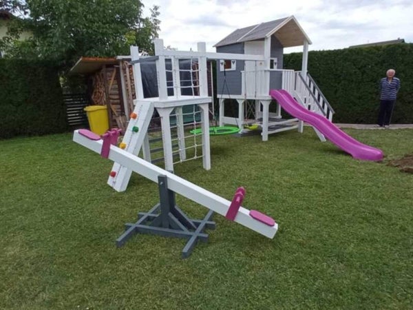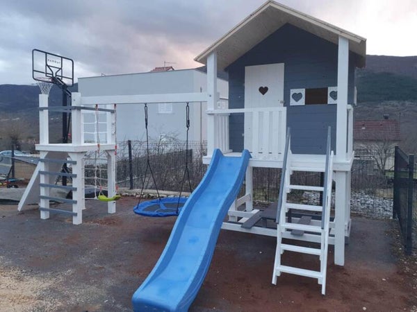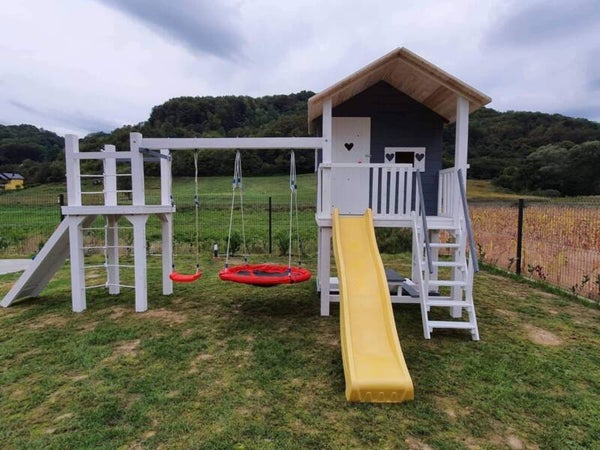 Drvena penjalica s toboganom i ljuljačkama.