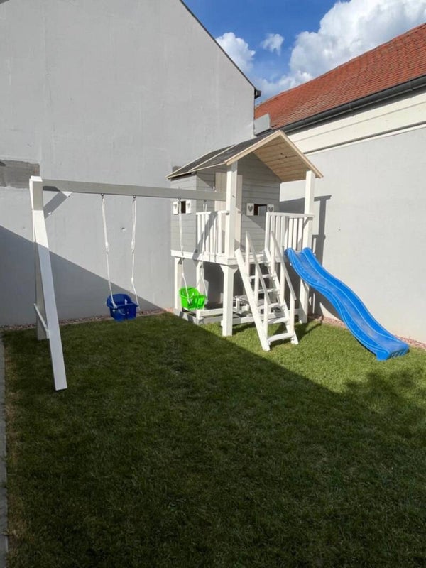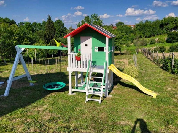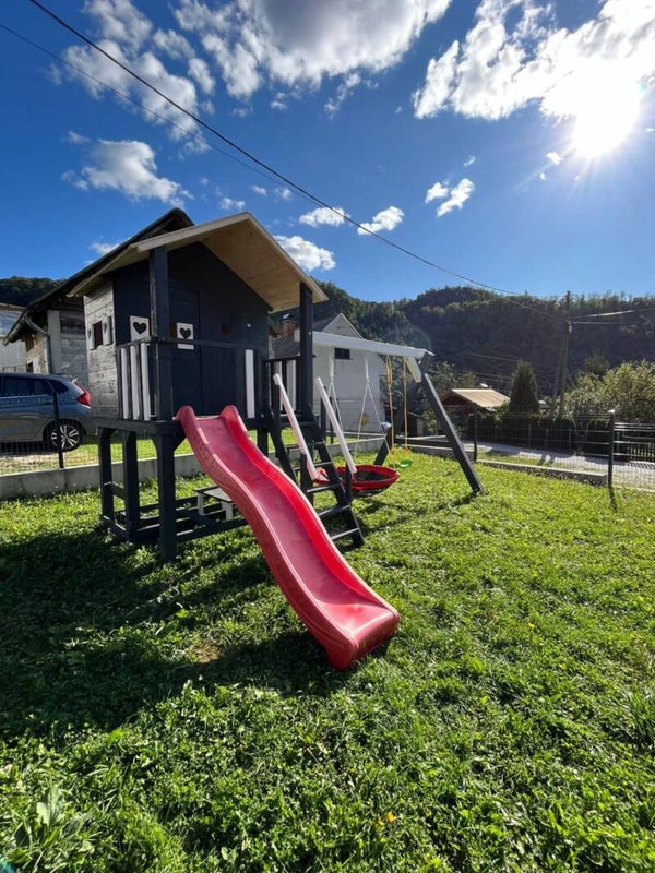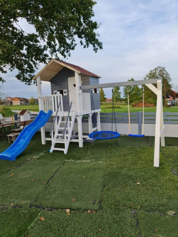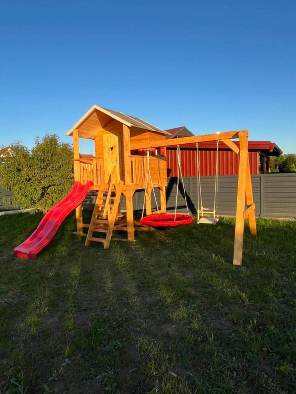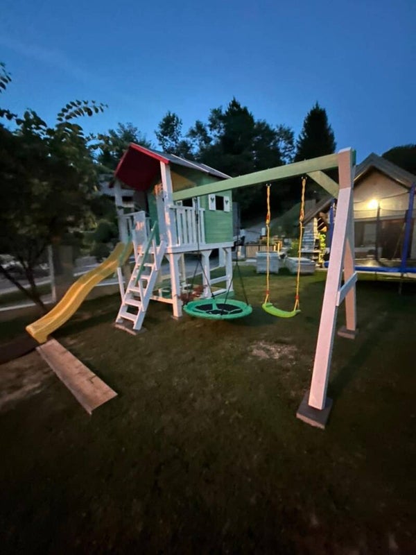 Drvena penjalica s toboganom i ljestvama te odvojenom klackalicom i ljuljačkom.